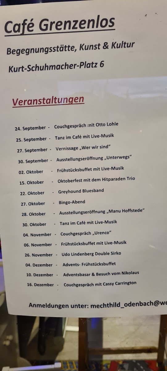 Welcome to Café Grenzenlos, a delightful café located at Kurt-Schumacher-Platz 6 in Gronau, Germany. This gem stands out for its warm, inviting atmosphere that encourages relaxation rather than rushing. Upon entering, guests are greeted by an eclectic mix of furniture, creating a cozy, vibrant setting perfect for conversation.